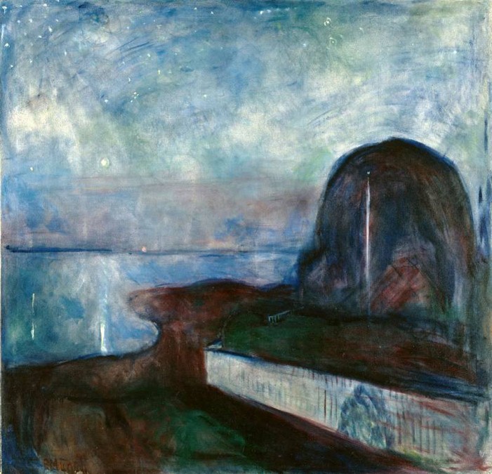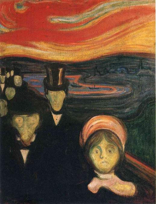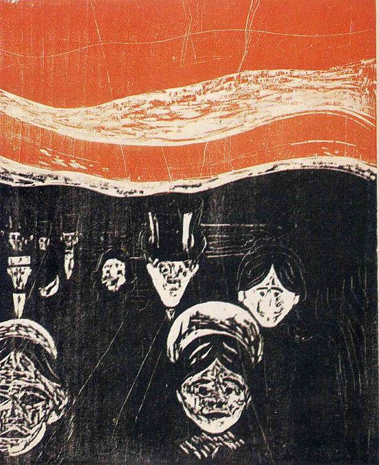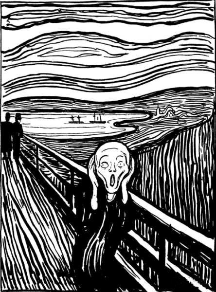 Я шёл по дороге с двумя приятелями, вдруг солнце зашло и всё небо стало кровавым, при этом я как будто почувствовал дыхание тоски. Я задержался, опёрся на балюстраду моста смертельно усталый. Над чёрно-голубым фьордом и городом висели клубы кровавого пара. Мои приятели пошли дальше, а я стоял, пригвождённый к месту, дрожа от страха. Я услышал ужасающий, нескончаемый крик природы. Эдвард Мунк о замысле картины «Крик» |