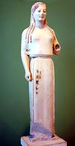 края льняного хитона и накидки – зелеными. Совершенно иной образ – высокая мраморная кора в роскошном коротком плаще, сохранившем местами зеленый цвет, сгущающийся до сизого в глубине ниспадающих складок. Левой рукой кора поддерживала струящийся розовато-коричневый хитон с сине-зеленой каймой по краю. Весь этот каскад драпировок, созвучный завитым прядям волос, складки одежды, то плавные, то резко обрывающиеся, волнообразно змеящиеся узоры говорят о натуре кокетливой и лукавой. Мерцающее в волосах золото, черные брови, красные губы и тронутые прозрачной синевой веки добавляют ее внешнему облику игривость и легкомыслие. В корах афинского Акрополя идеал женственности выражен в его первозданной чистоте. Неподвижность и скованность архаических поз в скульптуре постепенно сменили эмоциональные, полные жизни и ощущения скрытого движения скульптуры классической эпохи.