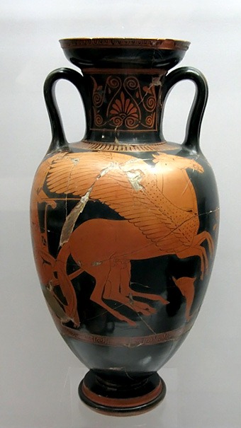 Горлышко и дно сосудов украшались узором, в том числе орнаментами, в основу которых положены вьющиеся растения и пальмовые листья. После обжига основа становилась красной, а глянцевая глина приобретала черный цвет. Белый цвет впервые стали использовать в Коринфе и прежде всего для того, чтобы отобразить белизну кожи у женских фигур. Центры чернофигурной вазописи - Афины и Коринф. Чернофигурная техника прекрасно отвечала задаче украшения Обведя контуры фигур, все свободные от изображений части вазы покрывали черным лаком. Затем птичьим пером или тонкой кисточкой художник наносил линии, передающие складки одежды, мускулы тела и черты лица. При обжиге лак приобретал ровную зеркальную поверхность с удивительным по красоте оливковым отливом, а светлые фигуры особенно выразительно выступали на этом фоне. Краснофигурная вазопись развивалась с последней трети VI по IV век до н.э., центром этого стиля были Афины. Краснофигурный стиль в свою очередь принято делить на строгий, свободный, роскошный и беглый стили. Самым ранним был строгий стиль, и сюжеты его росписей близки по тематике рисункам на античных чернофигурных вазах. Это прежде всего мифологические сцены: пиры богов, их борьба с гигантами, изображение бога Диониса; героический эпос – подвиги Геракла, античного героя Тезея, Троянский цикл, приключения Одиссея; наконец, изображение простых смертных, встречающееся чаще, чем на чернофигурных вазах. Образ человека, в облике которого выступал и герой, и